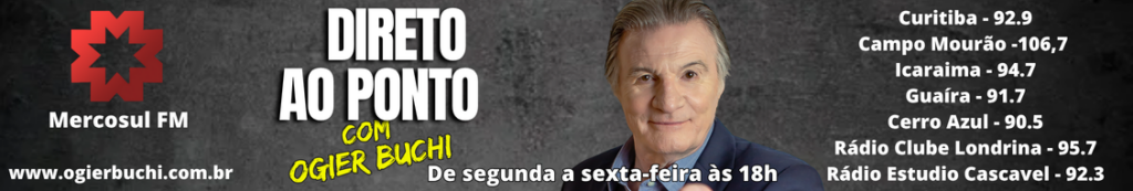Lançamento de plataforma legislativa, homenagens e visita do ex-presidente Michel Temer pautam semana na Assembleia Legislativa do Paraná Ratinho Júnior é o governador mais bem avaliado do Brasil, diz Veritá ASSISTEMÁTICO – Coluna semanal de Ogier Buchi – 17/04/2026 Últimas notícias Eduardo Pimentel assina decreto de criação da Patrulha da Vida e da Saúde FAKE NEWS DO PT : Deltan e PT travam disputa sobre inelegibilidade Eleições 2026: AGU orienta agentes públicos sobre condutas proibidas Missão francesa em Curitiba termina com balanço sobre avanço das obras do Bairro Novo do Caximba Paraná tem a 2ª maior quilometragem do Brasil em condição avaliada como ótima, mostra CNT Deputados destacam ações de cidadania e aproximação com a população na Assembleia Itinerante na ExpoLondrina DPU contesta Moraes no STF e aponta possível violação de garantias na defesa de ex-assessor Ponte de Guaratuba: instalação do asfalto avança no acesso de Matinhos MDB confirma chapa com Greca ao governo e Alvaro Dias ao Senado Moraes manda PF investigar Flávio Bolsonaro por post sobre Lula e abre novo inquérito no STF Pesquisa Genial/Quaest 2026: Lula lidera no 1º turno e empate técnico marca disputa com Flávio Bolsonaro no 2º Fachin repudia proposta de CPI para indiciar ministros do STF e fala em “desvio de finalidade” Ministros do STF reagem a relatório de CPI que pede indiciamento e falam em “abuso” e “constrangimento institucional” Ratinho Junior confirma Sandro Alex ao governo e Alexandre Curi ao Senado no Paraná Greca reafirma pré-candidatura ao Governo e movimentações de Ratinho indicam “meia chapa” do PSD Reviravolta no Paraná: Ratinho Junior surpreende e escolhe Sandro Alex como pré-candidato ao governo Voltar Mais Programa Direto ao Ponto com Ogier Buchi na Mercosul FM Confira mais vídeos do Programa Direto ao Ponto no YouTube DIRETO AO PONTO - Oposição vai pra cima de Gilmar Mendes - 22/04/2026 DIRETO AO PONTO - Fim da escala 6x1, é bom ou ruim? - 21/04/2026 DIRETO AO PONTO - Guerra Declarada! - 20/04/2026 DIRETO AO PONTO - Apresentação: Ogier Buchi & Henrique Giglio! DIRETO AO PONTO - Apresentação Ogier Buchi DIRETO AO PONTO - Entrevista com o pré-candidato a governador do Paraná - Luiz França - 16/04/2026