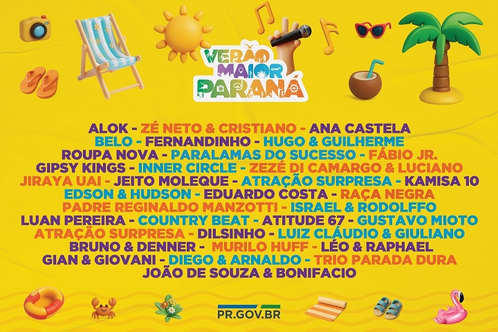 O Governo do Paraná anunciou nesta terça-feira (21) os nomes das atrações do Verão Maior Paraná 2026. São cinco finais de semana seguidos de espetáculos gratuitos, de 9 de janeiro a 8 de fevereiro. Entre as novidades estão shows nas quintas-feiras, atrações internacionais e palcos que devem ser maiores do que no ano passado. Os shows acontecerão nas praias de Matinhos e Pontal do Paraná e terão transmissão do SBT, Band, TVCI, Banda B e TV Paraná Turismo para todo o Brasil.