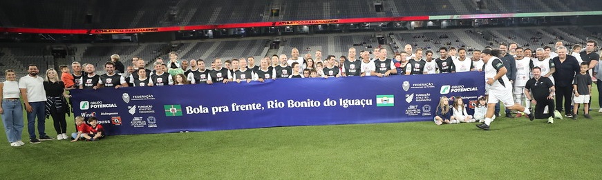 Esporte, diversão e, principalmente, solidariedade. Assim foi o “Bola pra Frente, Rio Bonito do Iguaçu”, evento esportivo realizado nesta quarta-feira (19), na Arena da Baixada, com a participação de craques históricos, ídolos dos clubes paranaenses, atletas que marcaram gerações dentro e fora dos gramados e deputados.