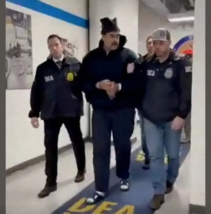 Após a captura, Maduro e a esposa foram levados de helicóptero sobre o mar até o navio militar USS Iwo Jima, que estava no Caribe há meses. Horas depois, por volta das 18h40 (horário de Brasília), o presidente venezuelano chegou aos Estados Unidos escoltado por agentes federais, algemado e vestindo roupas cinzas.