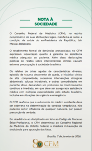 A entidade também destacou que manifestações públicas sobre intercorrências clínicas envolvendo Bolsonaro geram apreensão. “Declarações públicas de relatos sobre intercorrências clínicas causam extrema preocupação à sociedade brasileira”, acrescenta o texto.