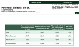 O Paraná Pesquisas entrevistou 2.080 eleitores em todo o país entre os dias 22 e 25 de fevereiro. A margem de erro é de 2,2 pontos percentuais, o nível de confiança é de 95%, De acordo com a Resolução-TSE n.º 23.600/2019, essa pesquisa está registrada no Tribunal Superior Eleitoral sob o n.º BR-07974/2026 para o cargo de Presidente.