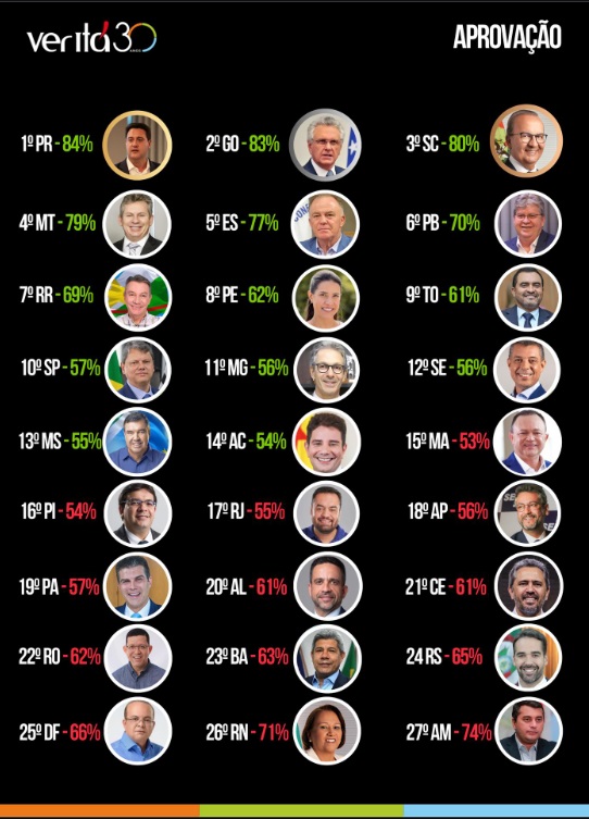 O ranking ainda mostra nomes como Mauro Mendes (79%), Renato Casagrande (77%) e João Azevêdo (70%) entre os mais bem avaliados do País.